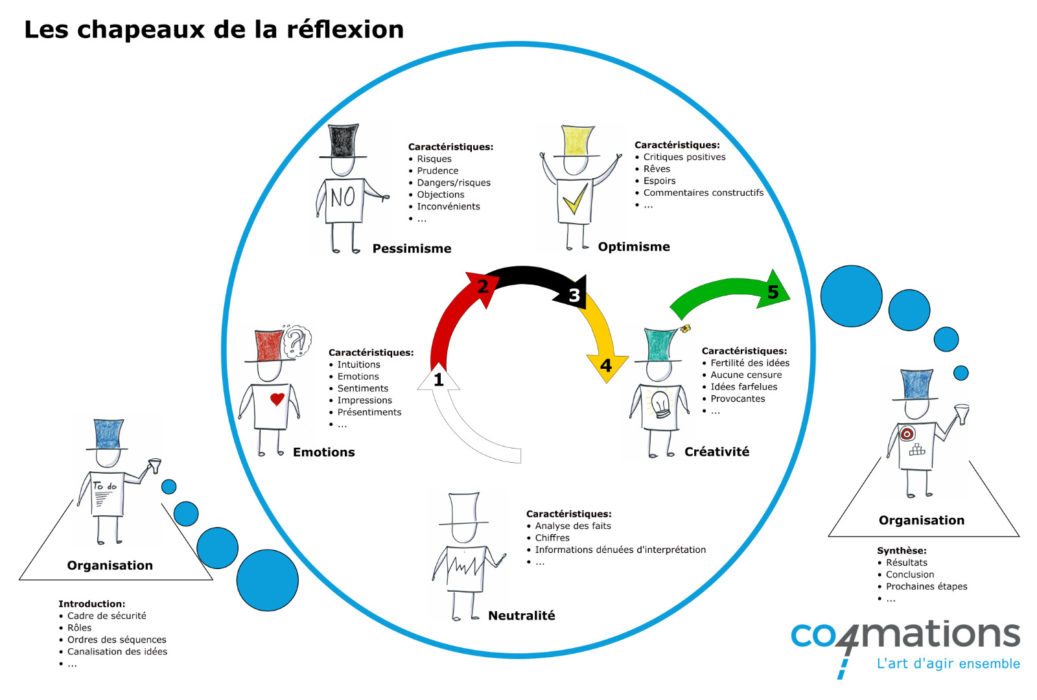 Particulièrement adaptée à l’exploration de sujets délicats, cette méthode permet à chacun de partager ses ressentis, d’adopter un regard critique et de formuler des propositions constructives. En facilitant la communication structurée, les “Chapeaux de la Réflexion” sont un outil puissant pour créer un terrain propice à la résolution collaborative de problèmes et à la prise de décisions éclairées.
