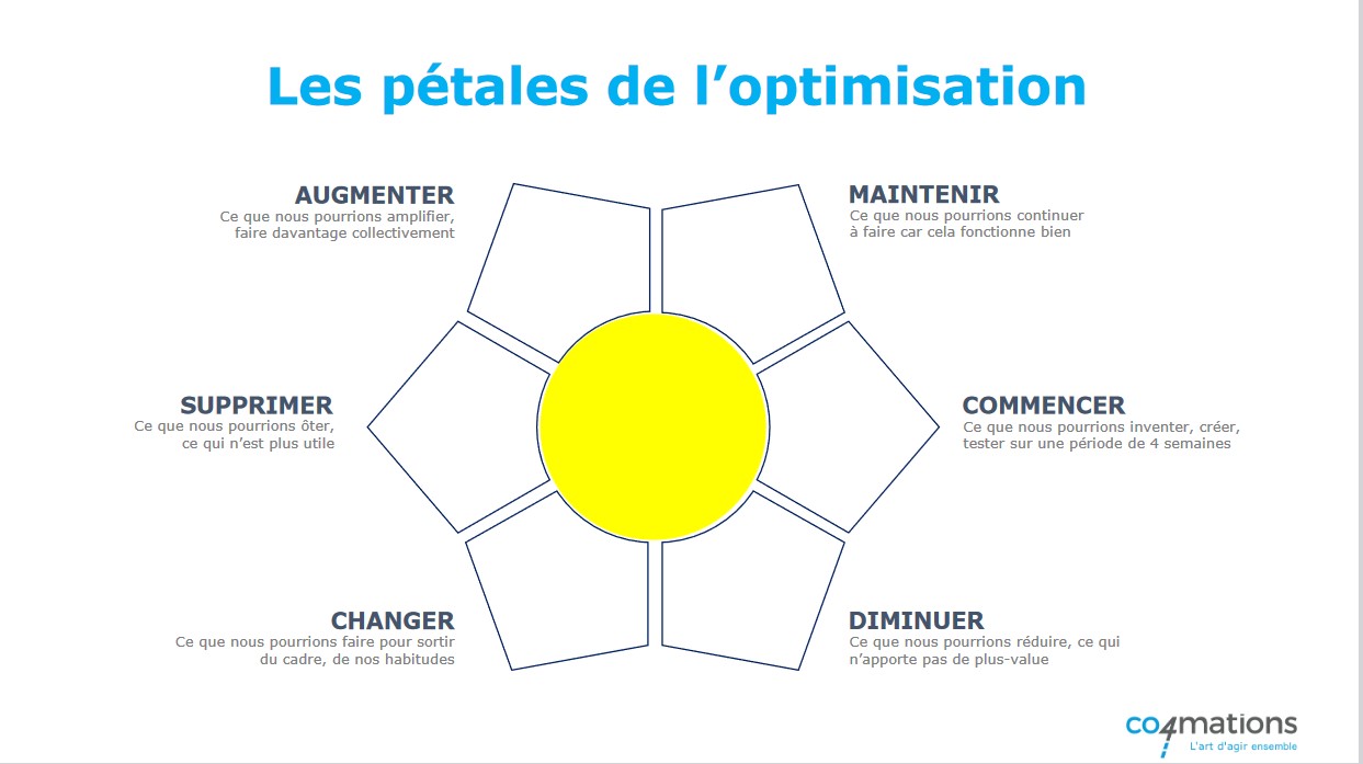 Bienvenue dans l’univers des “Pétales de l’Optimisation”, un modèle conçu pour cultiver une culture d’amélioration constante au sein de nos processus et actions. Cet outil novateur offre une approche structurée pour évaluer et optimiser vos pratiques, stimulant ainsi la réflexion sur les aspects essentiels de notre démarche.